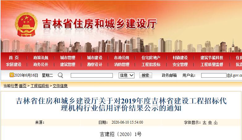吉林省住房和城乡建设厅关于对2019年度吉林省建设工程招标代理机构行业信用评价结果公示的通知 吉建招〔2020〕1号 各市(州)建委(住房城乡建设局),长白山管委会住房城乡建设局,各县(市)住房城乡建设局,各招标代理机构: 根据《吉林省建设工程招标代理机构行业信用综合评价办法》(吉建招〔2018〕2号)文件要求,我厅组织市(州)住房城乡建设行政主管部门对333户招标代理机构开展2019年度行业信用评价工作。 经市(州)住房城乡建设行政主管部门初评、省住房城乡建设厅审定,拟对72户招标代理机构信用评价为A等级,218户招标代理机构信用评价为B等级,43户招标代理机构信用评价为C等级;现将评价结果予以公示(见附件)。 欢迎社会各界和广大人民群众对公示的结果提出意见,进行监督。公示期间,按照属地管理的原则,向所在地市(州)住房城乡建设行政主管部门提出意见。对市(州)住房城乡建设行政主管部门答复有异议的,可向省建设工程招投标管理处提出书面申诉;书面申诉应阐明具体内容,并提供有关证据和准确的联系方式,否则不予受理。 联 系 人:刘艳莉 联系电话:0431-82752637 联系地址:长春市贵阳街287号 邮编:130051 公示日期:2020年6月10日-2020年6月16日 附件:2019年度吉林省建设工程招标代理机构行业信用评价结果汇总表 吉林省住房和城乡建设厅 2020年6月10日 附件: 2019年度吉林省建设工程招标代理机构行业信用评价结果汇总表.pdf