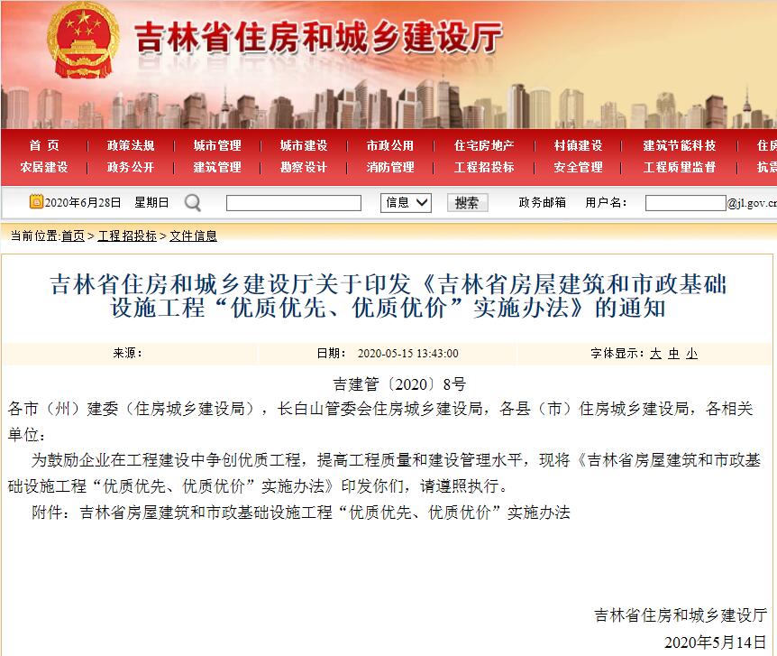 行业动态|关于印发《吉林省房屋建筑和市政基础设施工程“优质优先、优质优价”实施办法》的通知