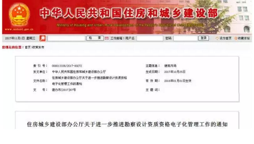 行业动态|勘察设计资质资格实行电子化管理,2018年1月1日起执行 住房城乡建设部办公厅关于进一步推进勘察设计资质资格电子化管理工作的通知 各省、自治区住房城乡建设厅,直辖市建委,北京市规划国土委,中央军委后勤保障部军事设施建设局: 为贯彻落实《国务院办公厅关于促进建筑业持续健康发展的意见》(国办发[2017]19号)精神,加快推进我部简政放权、放管结合、优化服务改革,提高勘察设计资质资格审批效率,加强事中事后监管,现就推进勘察设计资质资格电子化管理有关工作通知如下: 一、实行勘察设计注册工程师网上申报制度。向我部申请勘察设计注册工程师初始注册、延续注册、变更注册、注销注册时,须通过“全国一级注册建筑师、注册工程师注册管理信息系统”(以下简称“注册管理信息系统”)进行网上申报,不再提交纸质申报材料。具体申报程序如下: (一)申请注册人员登录我部网站(网址:www.mohurd.gov.cn)下载“注册管理信息系统”,打印并填写申请表,申请表经亲笔签名后连同相关附件材料一并提交聘用单位。 (二)聘用单位将经加盖本单位公章的申请表及相关附件扫描形成电子申报材料后,通过“注册管理信息系统”上报,相关纸质申报材料留存聘用单位备查。 (三)省级注册管理部门收到聘用单位上报的电子申报材料后,要按照《勘察设计注册工程师管理规定》处理,并在规定期限内将全部电子申报材料通过“注册管理信息系统”上报我部。 二、加强对申请勘察设计资质企业所报注册人员社保信息的审查。企业向我部申请勘察设计资质时,须报送由社会保险机构出具的注册人员在本企业缴纳社会保险费的证明。对于未在本企业缴纳社会保险费的注册人员,资质审查时不予认可。 三、各省级住房城乡建设主管部门要加快与有关部门和单位的信息整合和对接,加强本地区工程项目数据库建设。各地要按照《住房城乡建设部办公厅关于扎实推进建筑市场监管一体化工作平台建设的通知》(建办市函[2017]435号)要求,在2017年12月31日前完成工程项目信息补录工作,将工程项目的招标投标、施工图审查、合同备案、施工许可、竣工验收备案等环节的数据全部纳入省级建筑市场监管一体化工作平台,与全国建筑市场监管公共服务平台实时对接联通,并保证上传数据及时、准确、完整。 对申请建筑行业、市政行业及其相应专业(人防工程专业除外)工程设计甲级资质(包括申请施工总承包特级资质的企业同时申请的相应设计资质)的企业,未进入全国建筑市场监管公共服务平台的企业业绩和个人业绩,在资质审查时不作为有效业绩认定。 四、申请资质企业和申请注册人员电子申报材料格式和内容应当分别符合建设工程企业资质网上申报和审批系统、“注册管理信息系统”要求。 五、申请注册人员和申请资质企业应当对申报材料的真实性和有效性负责。若发现申报材料中存在虚假内容或者承诺情况与实际情况不符的,我部将依法予以严肃处理,并将其行为记入全国建筑市场监管公共服务平台,对社会公开。 六、加大对举报投诉的查处力度。对我部转地方核查的反映申请资质企业涉嫌弄虚作假或者申请注册人员涉嫌违规注册的举报投诉,有关省级住房城乡建设主管部门要按要求组织核查并及时报送核查结果。情况核查清楚后,我部依法做出处理决定。 七、加强资质动态核查。省级住房城乡建设主管部门应当按照“双随机、一公开”原则,每年以不低于5%的比例对本地区勘察设计企业资质进行动态核查,重点核查发生质量安全事故、存在建筑市场不良行为记录及注册人员被撤销、吊销注册执业证书的企业。经核查已不符合相应资质标准的企业,省级住房城乡建设主管部门要下发责令限期改正通知书,整改期一般为3个月,整改后仍不达标的,依法撤回相应资质。其中,对由我部审批的企业资质,省级住房城乡建设主管部门要将撤回资质建议及相应材料报我部处理。 本通知自2018年1月1日起执行。 中华人民共和国住房和城乡建设部办公厅 2017年10月25日 (此件主动公开) 抄送:住房城乡建设部执业资格注册中心。 上一篇:行业动态|《拖欠农民工工资“黑名单”管理暂行办法》自2018年1月1日起施行 下一篇:行业动态|母公司中标子公司施工是不是转包?全国人大复函住建部给出意见
